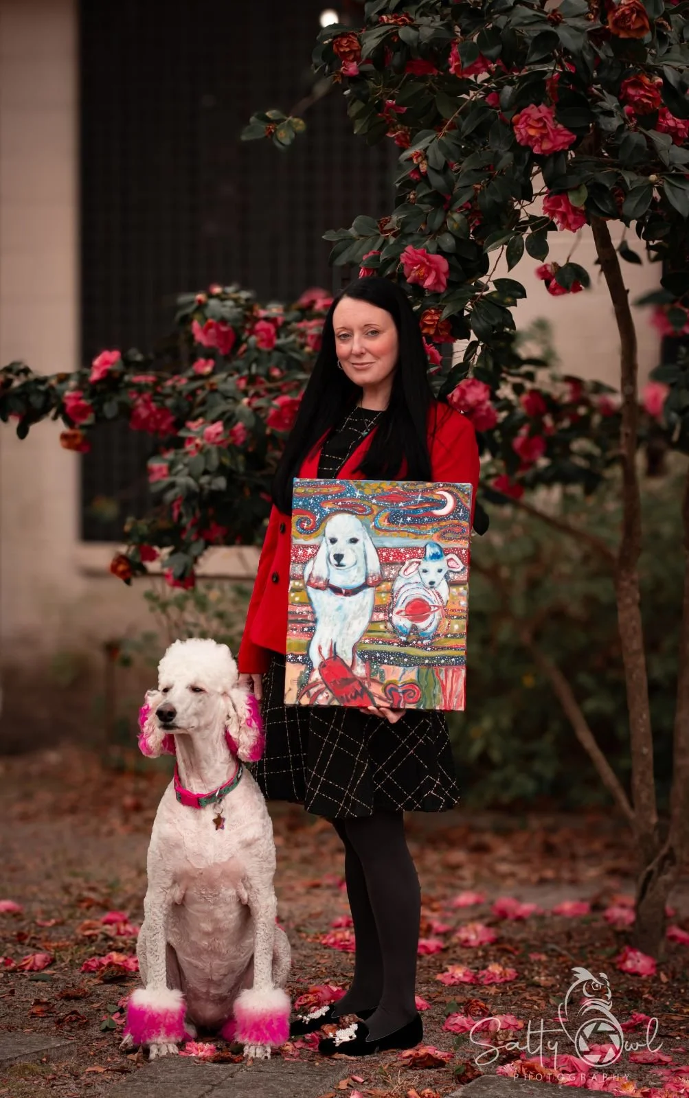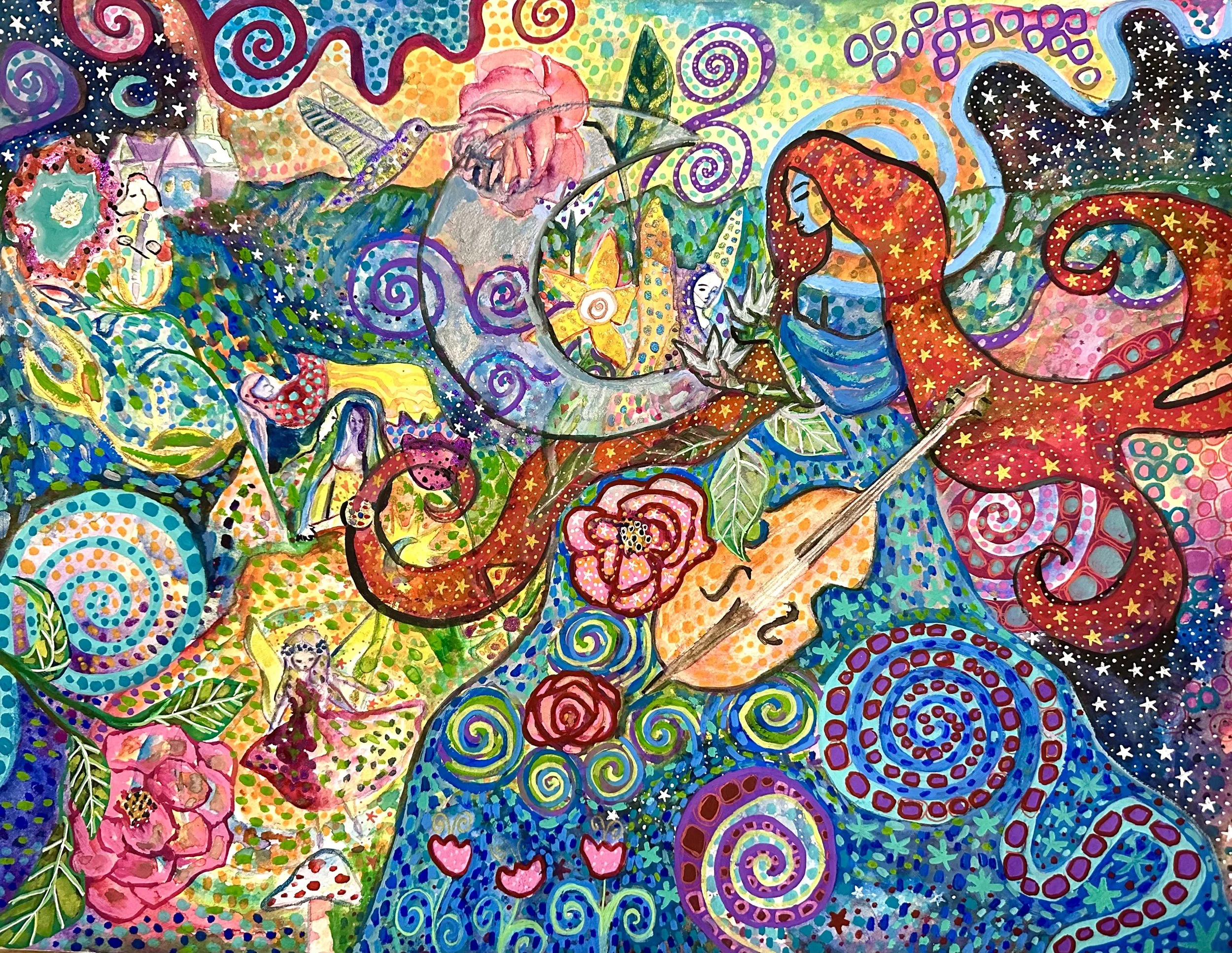 Wiggins’ most recent body of work is inspired by mediation, walks in nature, and her beloved poodle, Ziggy. Her paintings embody a spiritual authenticity with her own signature whimsical flair. Influenced by German expressionism and women surrealists, her work speaks to the artist’s personal experiences, connections, and emotions, making each piece a diary-like entry of celestial swirls.